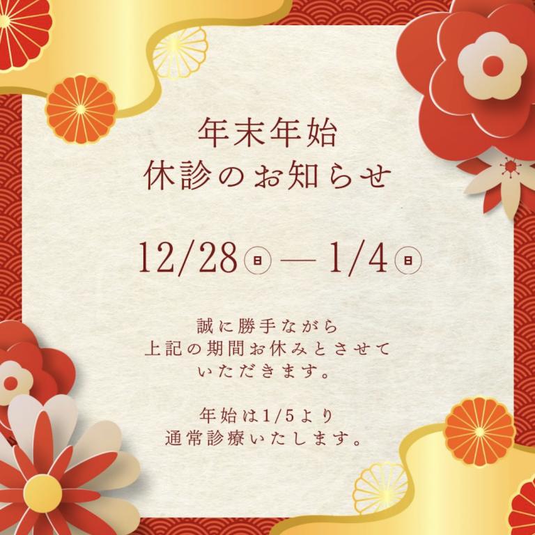 【当院の年末年始の診療案内】 2025年12月28日(日)〜1月4日(日)まで休診、 2026年1月5日(月)から通常診療を開始します。